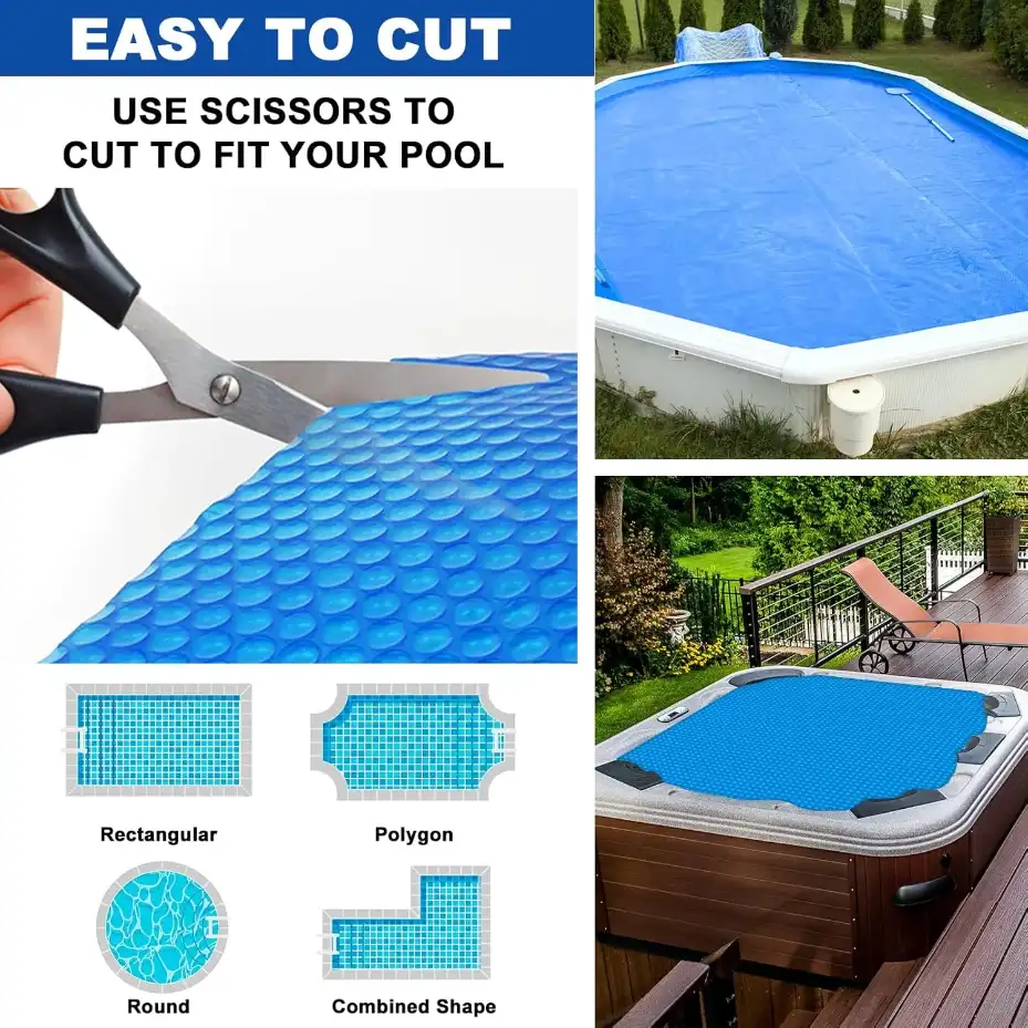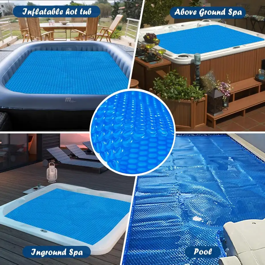 The majority of 1-4 person hot tubs can be accommodated by our 4.5 x 4.5 FT hot tub bubble blanket, which also allows for trim-to-fit customisation for irregular shapes. Regardless of the particular size or design of your spa, this adaptability guarantees flawless coverage.The trim-to-fit procedure is simple: